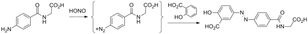 - Starting material is 4-aminohippuric acid, obtained by coupling para-aminobenzoic acid and glycine.