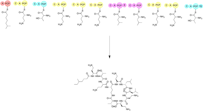 The biosynthesis of colistin requires the use of three amino acids: threonine, leucine, and 2,4-diaminobutryic acid. The linear form of colistin is synthesized before cyclization. Non-ribosomal peptide biosynthesis begins with a loading module and then the addition of each subsequent amino acid. The subsequent amino acids are added with the help of an adenylation domain (A), a peptidyl carrier protein domain (PCP), an epimerization domain (E), and a condensation domain (C). Cyclization is accomplished by a thioesterase.[71] The first step is to have a loading domain, 6-methylheptanoic acid, associate with the A and PCP domains. Now with a C, A, and PCP domain that is associated with 2,4-diaminobutryic acid. This continues with each amino acid until the linear peptide chain is completed. The last module will have a thioesterase to complete the cyclization and form the product colistin.