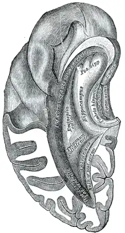 ![]() Posterior and inferior cornua of left lateral ventricle exposed from the side. | |