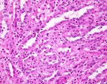 Collecting duct carcinoma (CDC) is a type of kidney cancer that originates in the papillary duct of the kidney. It is rare, accounting for 1-3% of all kidney cancers.[2] It is also recently described; a 2002 review found just 40 case reports worldwide.[3] Previously, due to its location, CDC was commonly diagnosed as renal cell carcinoma or a subtype of renal cell carcinoma.[4] However, CDC does not respond well to chemotherapy drugs used for renal cell carcinoma, and progresses and spreads more quickly.