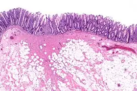 Micrograph showing a colorectal polypectomy scar. H&E stain.