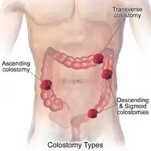 Placement of the stoma on the abdomen can occur at any location along the colon, but the most common placement is on the lower left side near the sigmoid where a majority of colon cancers occur. Other locations include the ascending, transverse, and descending sections of the colon.[4]