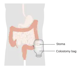 A colostomy is an opening (stoma) in the large intestine (colon), or the surgical procedure that creates one. The opening is formed by drawing the healthy end of the colon through an incision in the anterior abdominal wall and suturing it into place. This opening, often in conjunction with an attached ostomy system, provides an alternative channel for feces to leave the body. Thus if the natural anus is unavailable for that function (for example, in cases where it has been removed as part of treatment for colorectal cancer or ulcerative colitis), an artificial anus takes over. It may be reversible or irreversible, depending on the circumstances.