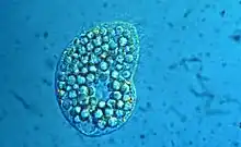 The Colpodea are a class of ciliates, of about 200 species common in freshwater and soil habitats. The body cilia are typically uniform, and are supported by dikinetids of characteristic structure, with cilia on both kinetosomes. The mouth may be apical or ventral, with more or less prominent associated polykinetids. Many are asymmetrical, the cells twisting sideways and then untwisting again prior to division, which often takes place within cysts. Colpoda, a kidney-shaped ciliate common in organic rich conditions, is representative.