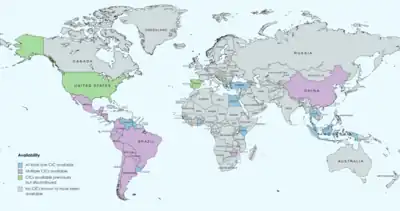 CICs are available in many countries throughout the world, including widely throughout Central and South America, in Mexico and the Caribbean, in China, in several Southeast Asian and African countries, and in Turkey.[21][22][23][13][2][14][15][16][17] They were also previously available in the United States, Portugal, and Spain, but have been discontinued in these countries.[22][23]