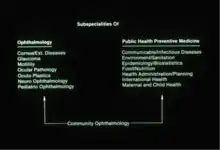 Community ophthalmology was described as a new discipline in medicine promoting eye health and blindness prevention through programs utilizing methodologies of public health, community medicine and ophthalmology in 1978. This new discipline was first proposed[1] by Dr. Patricia E. Bath in 1978 after observations of epidemics rates of preventable blindness among under-served populations in urban areas in the US as well as under-served populations in so called third-world countries.[2][3]