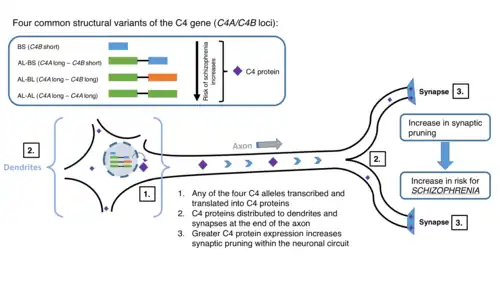 Data and information collected internationally can shed light onto the mysteries of schizophrenia. Sekar et al. analyzed single nucleotide polymorphisms (SNP) of 40 cohorts in 22 countries, in total adding up to nearly 29,000 cases.[1] They found out two features: 1) A great number of SNPs reaching only 2Mb across the end, 2) peak of association centered at C4, predicting that C4A expression levels is most strongly correlated with schizophrenia.[1] In addition, they have discovered a mechanism by which schizophrenia could arise from the genetic predisposition of the human complement C4.[1] As shown in Figure 1, four common structural variations discovered in genome-wide association studies (GWAS) studies have pointed to the high turnout of schizophrenia.[1] Possibly, the higher levels of expression of C4 protein due to pattern of variants of the C4 gene, allows for the unwanted increase in synaptic pruning (an effect produced by the effector proteins of the complement system in which the C4 partakes).