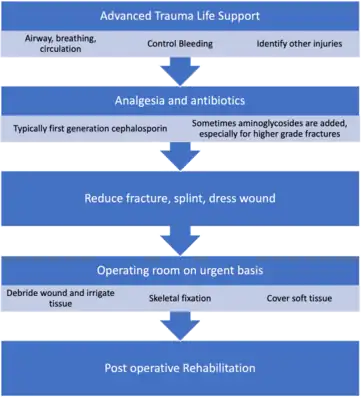 - ↑ "Open Fractures - OrthoInfo - AAOS". www.orthoinfo.org. Retrieved March 26, 2023.
