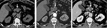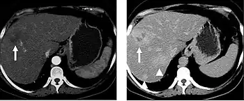 The late arterial phase is timed to correspond to the peak concentration of contrast material in highly vascular tumors and is performed approximately 20–35 seconds after the injection of intravenous contrast. Early arterial phase imaging is predominantly utilized for angiography and will be discussed separately. Late arterial phase imaging is almost always performed in conjunction with other phases (e.g. portal venous phase) to allow more complete characterization of any identified abnormalities (figure 4). The primary indication for a late arterial phase is for the evaluation of hypervascular tumors of the liver such as hepatocellular carcinoma or hypervascular metastases (figure 4). Typical hypervascular tumors for which this would be used include: hepatocellular carcinoma; renal cell carcinoma; melanoma; carcinoid/neuroendocrine tumors; some sarcomas; choriocarcinoma; and thyroid carcinoma. Although a "hypervascular", biphasic evaluation would generally be used for these patients, note that a single phase is often adequate for follow up imaging.