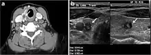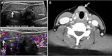 - ↑ Salvatori, M.; Melis, L.; Castaldi, P.; Maussier, M. L.; Rufini, V.; Perotti, G.; Rubello, D. (September 2007). "Clinical significance of focal and diffuse thyroid diseases identified by (18)F-fluorodeoxyglucose positron emission tomography". Biomedicine & Pharmacotherapy. 61 (8): 488–493. doi:10.1016/j.biopha.2007.05.001. ISSN 0753-3322. PMID 17604940.