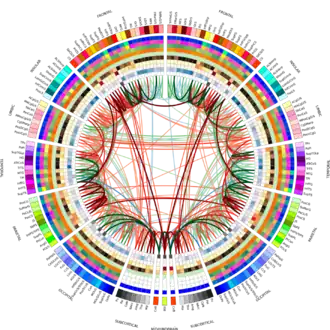 With the recent concerted push to map all of the human brain and its connections,[8][9] it has become increasingly important to find ways to graphically represent the large amounts of data involved in connectomics. Most other representations of the connectome use 3 dimensions, and therefore require an interactive graphical user interface.[1] The connectogram can display 83 cortical regions within each hemisphere, and visually display which areas are structurally connected, all on a flat surface. It is therefore conveniently filed in patient records, or to display in print. The graphs were originally developed using the visualization tool called Circos.[10][11]