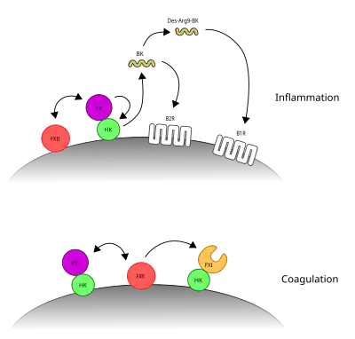 In the contact activation system or CAS, three proteins in the blood, factor XII (FXII), prekallikrein (PK) and high molecular weight kininogen (HK), bind to a surface and cause blood coagulation and inflammation. FXII and PK are proteases and HK is a non-enzymatic co-factor. The CAS can activate the kinin–kallikrein system and blood coagulation through its ability to activate multiple downstream proteins. The CAS is initiated when FXII binds to a surface and reciprocal activation of FXII and PK occurs, forming FXIIa and PKa. FXIIa can initiate the coagulation cascade by cleaving and activating factor XI (FXI), which leads to formation of a blood clot. Additionally, the CAS can activate the kinin–kallikrein system when PKa cleaves HK to form cHK, releasing a peptide known as bradykinin (BK). BK and its derivatives bind to bradykinin receptors B1 and B2 to mediate inflammation.[1][2][3]