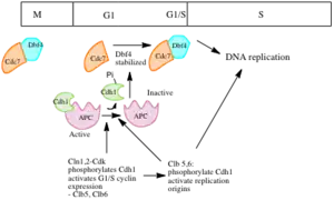 In budding yeast, CDK is the key regulator of pre-RC assembly.[3] Evidence for this is that inactivation of CDKs in cells arrested in G2/M or in S phase drives reassembly of pre-RCs.[1] CDK acts by inhibiting the individual components of the pre-RC. CDK phosphorylates Cdc6 to mark it for degradation by the SCF in late G1 and early S phase.[1] CDK also induces export of Mcm complexes and Cdt1 from the nucleus.[1] Evidence that CDKs regulate the localization of Mcm2-7 is that inactivation of CDKs in nocodazole arrested cells induced accumulation of Mcm2-7 in the nucleus.[1] Cdt1 is also exported because it binds to the Mcm complex. In Mcm depleted cells, Cdt1 did not accumulate in the nucleus. Conversely, when a nuclear localization signal was attached to Mcm7, Mcm2-7 and Cdt1 were always found in the nucleus.[1] Export of Mcm from the nucleus prevents loading of new Mcm complexes but does not affect the complexes that have already been loaded onto the DNA.[3] CDK also phosphorylates ORC proteins. It has been suggested that phosphorylation affects the ability of the ORC to bind other components of the pre-RC.[3] To get substantial re-replication of DNA, regulation of all three components, Cdc6, Mcm2-7 and the ORC has to be prevented. Having multiple mechanisms to prevent re-replication is beneficial because it the regulatory network continues to function even if one of the components fails.[3]