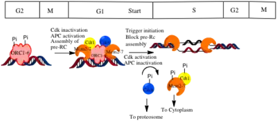 A two-step mechanism ensures that DNA is replicated only once per cycle. Assembly of the pre-RC complex (licensing) is limited to late mitosis and early G1 because it can occur only when CDK activity is low, and APC activity is high. Origin firing occurs only in S phase, when the APC is inactivated, and CDKs are activated.[1]