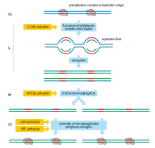 A key feature of the DNA replication mechanism in eukaryotes is that it is designed to replicate relatively large genomes rapidly and with high fidelity. Replication is initiated at multiple origins of replication on multiple chromosomes simultaneously so that the duration of S phase is not limited by the total amount of DNA.[1] This flexibility in genome size comes at a cost: there has to be a high-fidelity control system that coordinates multiple replication origins so that they are activated only once during each S phase. If this were not the case, daughter cells might inherit an excessive amount of any DNA sequence, which could lead to many harmful effects.[2]