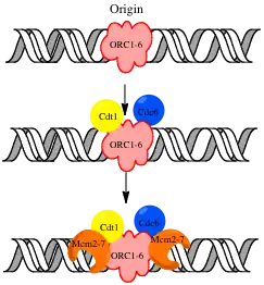 Cdc6 and Cdt1 assemble on the ORC and recruit the Mcm proteins.[3] Homologs for these two S. cerevisiae proteins have been found in all eukaryotes.[3] Studies have shown that these proteins are necessary for DNA replication. Mutations in S. pombe cdt1 blocked DNA replication.[6]