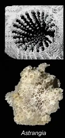 A corallite is the skeletal cup, formed by an individual stony coral polyp, in which the polyp sits and into which it can retract. The cup is composed of aragonite, a crystalline form of calcium carbonate, and is secreted by the polyp. Corallites vary in size, but in most colonial corals they are less than 3 mm (0.12 in) in diameter.[1] The inner surface of the corallite is known as the calyx. The vertical blades inside the calyx are known as septa and in some species, these ridges continue outside the corallite wall as costae.[2] Where there is no corallite wall, the blades are known as septocostae. The septa, costae and septocostae may have ornamentation in the form of teeth and may be thick, thin or variable in size. Sometimes there are paliform lobes, in the form of rods or blades, rising from the inner margins of the septa. These may form a neat circle called the paliform crown. The septa do not usually unite in the centre of the corallite, instead they form a columella, a tangled mass of intertwined septa, or a dome-shaped or pillar-like projection. In the living coral, the lower part of the polyp is in intimate contact with the corallite, and has radial mesenteries between the septa which increase the surface area of the body cavity and aid digestion. The septa, palliform lobes and costae can often be seen through the coenosarc, the layer of living tissue that covers the coenosteum, the part of the skeleton between the corallites.[3][4]