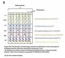 A cortical minicolumn (also called cortical microcolumn[1]) is a vertical column through the cortical layers of the brain. Neurons within the microcolumn "receive common inputs, have common outputs, are interconnected, and may well constitute a fundamental computational unit of the cerebral cortex".[2][3] Minicolumns comprise perhaps 80–120 neurons, except in the primate primary visual cortex (V1), where there are typically more than twice the number. There are about 2×108 minicolumns in humans.[4] From calculations, the diameter of a minicolumn is about 28–40 μm.[2] Minicolumns grow from progenitor cells within the embryo and contain neurons within multiple layers (2–6) of the cortex.[5]