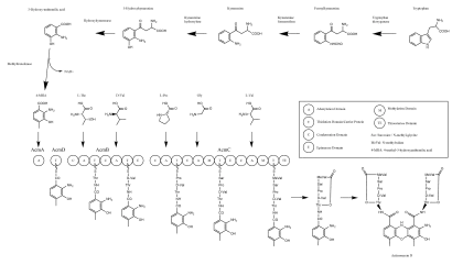 Early experiments elucidated the presence of non-ribosomal peptide synthetases,[24][25][26][27] and subsequent purification and heterologous expression experiments[24][25][28][29] showed the acmD and acmA genes to be responsible for activation of the 4-MHA, which then undergoes chain elongation through the action of the acmB and acmC genes. In total, the NRPS assembly line is composed of twenty-two modules, including two each of epimerase and methylase domains.[30][23] Recent sequencing of the actinomycin D gene cluster in Streptomyces chrysomallus showed that the four NRPS genes were surrounded on both sides by the two clusters of the genes involved in the well-studied kynurenine pathway and responsible for the production of 4-MHA from tryptophan, with nine paralogs identified between the two clusters.[23]