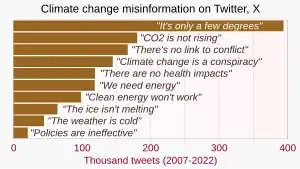 Climate change denial (also global warming denial) is a form of science denial characterized by rejecting, refusing to acknowledge, disputing, or fighting the scientific consensus on climate change. Those promoting denial commonly use rhetorical tactics to give the appearance of a scientific controversy where there is none.[24] Climate change denial includes unreasonable doubts about the extent to which climate change is caused by humans, its effects on nature and human society, and the potential of adaptation to global warming by human actions.[25][26][27]: 170–173 To a lesser extent, climate change denial can also be implicit when people accept the science but fail to reconcile it with their belief or action.[26] Several studies have analyzed these positions as forms of denialism,[28]: 691–698 pseudoscience,[29] or propaganda.[30]: 351