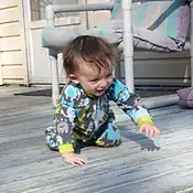 Crawling or quadrupedal movement is a method of human locomotion that makes use of all four limbs. It is one of the earliest gaits learned by human infants,[1] and has similar features to four-limbed movement in other primates and in non-primate quadrupeds.[2]