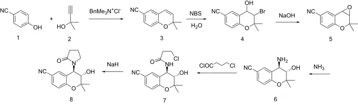 - ↑ Ashwood VA, Buckingham RE, Cassidy F, Evans JM, Faruk EA, Hamilton TC, et al. (November 1986). "Synthesis and antihypertensive activity of 4-(cyclic amido)-2H-1-benzopyrans". Journal of Medicinal Chemistry. 29 (11): 2194–201. doi:10.1021/jm00161a011. PMID 3783581.