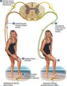 The crossed extensor reflex or crossed extensor response or crossed extension reflex is a reflex in which the contralateral limb compensates for loss of support when the ipsilateral limb withdraws from painful stimulus in a withdrawal reflex.[1] During a withdrawal reflex, the flexors in the withdrawing limb contract and the extensors relax, while in the other limb, the opposite occurs as part of the crossed extensor reflex. To provide a more clear explanation, this opposite occurrence means one limb with perform flexion at the hip and knee with the extensors relaxed, while the other limb will perform extension at the hip and knee while flexors are relaxed.[2] Besides shifting the body weight to the other side, the reflex pathway is also associated with leg coordination when walking by flexing muscle on one side, while extending muscle on the other side.[1] This crossed extensor response is properly part of the withdrawal reflex.[3]