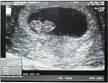 Crown rump length before a gestational age of 9 weeks is extrapolated by assuming a crown rump length of 0 at a gestational age of 2 weeks, corresponding to an embryonic age of 0 weeks. This extrapolated part is blurred because of uncertain values. - 1 2 Verburg BO, Steegers EA, De Ridder M, Snijders RJ, Smith E, Hofman A, et al. (April 2008). "New charts for ultrasound dating of pregnancy and assessment of fetal growth: longitudinal data from a population-based cohort study". Ultrasound in Obstetrics & Gynecology. 31 (4): 388–96. doi:10.1002/uog.5225. PMID 18348183. S2CID 349860.