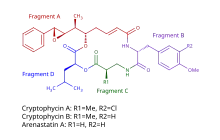 - ↑ Panda, D; Himes, RH; Moore, RE; Wilson, L; Jordan, MA (21 October 1997). "Mechanism of action of the unusually potent microtubule inhibitor cryptophycin 1". Biochemistry. 36 (42): 12948–53. doi:10.1021/bi971302p. PMID 9335554.