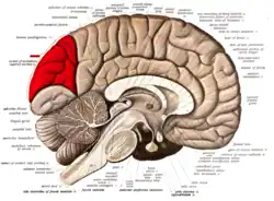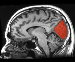 ![]() Sagittal MRI slice with the cuneus and lingual gyrus shown in red. | |