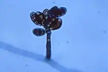Curvularia geniculata colonies grown on Oxford agar can grow rapidly to 3–5 cm in diameter, with a dark brown and hairy appearance.[1] The fungus produces conidiophores up to 600 μm long, becoming lighter near the tip, and are septate, meaning the structure is subdivided by walls called septa.[2] The conidiophores will produce 4-septate[1] conidia (18–37 x 8–14 μm),[1] consisting of a curved, broad central section that is dark brown[4] and paler tapered ends.[1] C. geniculata can be mistaken for Curvularia lunata because the latter is more commonly found.[2] These two can be distinguished because C. lunata produces 3-septate conidia.[2]