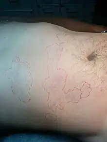 Cutis marmorata (from Latin marmor, "marble") is a benign skin condition which, if persistent, occurs in Cornelia de Lange syndrome, trisomy 13 and trisomy 18 syndromes.[1] When a newborn infant is exposed to low environmental temperatures, an evanescent, lacy, reticulated red and/or blue cutaneous vascular pattern appears over most of the body surface. This vascular change represents an accentuated physiologic vasomotor response that disappears with increasing age, although it is sometimes discernible even in older children. It is also seen in cardiogenic shock.