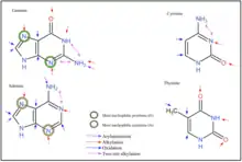 - ↑ Wyatt MD, Pittman DL (December 2006). "Methylating agents and DNA repair responses: Methylated bases and sources of strand breaks". Chemical Research in Toxicology. 19 (12): 1580–1594. doi:10.1021/tx060164e. PMC 2542901. PMID 17173371.