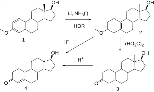 This reaction, now known as the Birch reduction,[51] is typified by the treatment of the monomethyl ether of estradiol (1) with a solution of lithium metal in liquid ammonia in the presence of alcohol as a proton source. Initial reaction constituents of 1,4-dimetalation of the most electron deficient positions of the aromatic ring–in the case of an estrogen, the 1 and 4-positions. Rxn of the intermediate with the proton source leads to a dihydrobenzene; a special virtue of this sequence in steroids is the fact that the double bind at 2 is in effect becomes an enol ether moiety. Treatment of this product (2) with weak acid, oxalic acid for e.g., leads to the hydrolysis of the enol ether, producing β,γ-unconjugated ketone 3. Hydrolysis under more strenuous conditions (mineral acids) results in migration/conjugation of the olefin to yield nandrolone (4).
