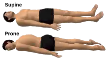 - Prone: lying on the chest with the face down ("lying down" or "going prone"). See also "Prostration".