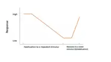 Another unique way to study infants' cognition is through habituation, which is the process of repeatedly showing a stimulus to an infant until they give no response.[72] Then, when infants are presented with a novel stimulus, they show a response, which reveals patterns of cognition and perception.[72] Using this study method, many different cognitive and perceptual ideas can be studied. Looking time, a common measure of habituation, is studied by recording how long an infant looks at a stimulus before they are habituated to it. Then, researchers record if an infant becomes dishabituated to a novel stimulus. This method can be used to measure preferences infants, including preferences for colors,[73] and other discriminatory tasks, such as auditory discrimination between different musical excerpts.[74]