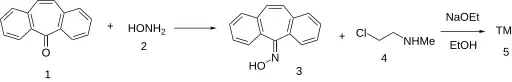The ketone dibenzosuberenone (1) is treated with hydroxylamine (2) to give its ketoxime (3). Base-catalyzed alkylation with ClCH2CH2NHCH3 (4) yields demexiptiline.[5][6]