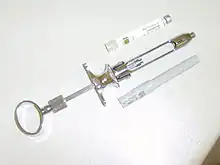 A dental syringe is a syringe for the injection of a local anesthetic.[25] It consists of a breech-loading syringe fitted with a sealed cartridge containing an anesthetic solution.