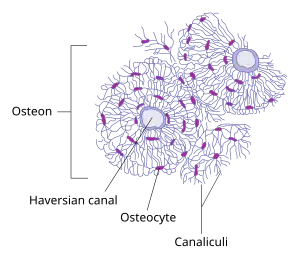 ![]() Diagram of cross-section of bone osteons showing osteocytes and interconnecting canaliculi. | |