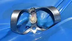 The dental dam is anchored around the crown of the tooth using a metal clamp to seal and secure the rubber dam sheet to the tooth or teeth that are receiving treatment during the dental procedure. The clamps come in a variety of shapes and sizes which suit the anatomy of the different teeth in the mouth. Before placing the dam in the mouth dental professionals may choose to secure dental floss around the clamps; this acts as an anchor to prevent aspiration or swallowing. It can also provide a point of reference for the clinician to be able to visualise and retrieve the clamp if it dislodges from the tooth or the dam forceps.[2]