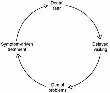 Dental fear, or dentophobia, is a normal emotional reaction to one or more specific threatening stimuli in the dental situation.[1][2] However, dental anxiety is indicative of a state of apprehension that something dreadful is going to happen in relation to dental treatment, and it is usually coupled with a sense of losing control.[1] Similarly, dental phobia denotes a severe type of dental anxiety, and is characterized by marked and persistent anxiety in relation to either clearly discernible situations or objects (e.g. drilling, local anesthetic injections) or to the dental setting in general.[1] The term ‘dental fear and anxiety’ (DFA) is often used to refer to strong negative feelings associated with dental treatment among children, adolescents and adults, whether or not the criteria for a diagnosis of dental phobia are met. Dental phobia can include fear of dental procedures, dental environment or setting, fear of dental instruments or fear of the dentist as a person.[3] People with dental phobia often avoid the dentist and neglect oral health, which may lead to painful dental problems and ultimately force a visit to the dentist. The emergency nature of this appointment may serve to worsen the phobia. This phenomenon may also be called the cycle of dental fear.[3] Dental anxiety typically starts in childhood.[1] There is the potential for this to place strains on relationships and negatively impact on employment.[4]