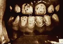 In 1901 Eager published the first description of the "mottled enamel" of immigrants from a small village near Naples, Italy.[33] He writes that the condition is called "Denti di Chiaie" (Chiaie teeth), named after Stefano Chiaie, an Italian professor.[33] In the United States of America, a dentist, Frederick McKay, set up practice in Colorado Springs in 1901 and discovered a high proportion of the residents had stained teeth, locally termed the "Colorado brown stain".[12] He took this information to Greene Vardiman Black, a prominent American dentist of the time. After examining specimens of affected enamel, in 1916 Black described the condition as "[a]n endemic imperfection of the enamel of the teeth, heretofore unknown in the literature of dentistry."[12] They made the interesting observation that although the mottled enamel was hypomineralized, and therefore should be more susceptible to decay, this was not the case.[12] Gradually, they became aware of existing and further reports of a similar condition worldwide.[12]