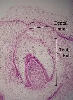 The dental lamina is a band of epithelial tissue seen in histologic sections of a developing tooth.[1][2] The dental lamina is first evidence of tooth development and begins (in humans) at the sixth week in utero or three weeks after the rupture of the buccopharyngeal membrane. It is formed when cells of the oral ectoderm proliferate faster than cells of other areas. Best described as an in-growth of oral ectoderm, the dental lamina is frequently distinguished from the vestibular lamina, which develops concurrently. This dividing tissue is surrounded by and, some would argue, stimulated by ectomesenchymal growth. When it is present, the dental lamina connects the developing tooth bud to the epithelium of the oral cavity. Eventually, the dental lamina disintegrates into small clusters of epithelium and is resorbed. In situations when the clusters are not resorbed, (this remnant of the dental lamina is sometimes known as the glands of Serres) eruption cysts are formed over the developing tooth and delay its eruption into the oral cavity. This invagination of ectodermal tissues is the progenitor to the later ameloblasts and enamel while the ectomesenchyme[3] is responsible for the dental papilla and later odontoblasts.