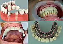 A dental prosthesis is an intraoral (inside the mouth) prosthesis used to restore (reconstruct) intraoral defects such as missing teeth, missing parts of teeth, and missing soft or hard structures of the jaw and palate.[1] Prosthodontics is the dental specialty that focuses on dental prostheses. Such prostheses are used to rehabilitate mastication (chewing), improve aesthetics, and aid speech. A dental prosthesis may be held in place by connecting to teeth or dental implants, by suction, or by being held passively by surrounding muscles. Like other types of prostheses, they can either be fixed permanently or removable; fixed prosthodontics and removable dentures are made in many variations. Permanently fixed dental prostheses use dental adhesive or screws, to attach to teeth or dental implants. Removal prostheses may use friction against parallel hard surfaces and undercuts of adjacent teeth or dental implants, suction using the mucous retention (with or without aid from denture adhesives), and by exploiting the surrounding muscles and anatomical contours of the jaw to passively hold in place.[2]