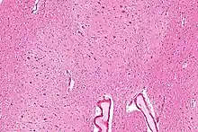 The dentate nucleus refer to a pair of deep cerebellar nuclei deep within the white matter of the cerebellum of the brain with a dentate – tooth-like or serrated – edge. The dentate forms the largest pathway between the cerebellum and the remainder of the brain.[1] It is the largest and most lateral of the four pairs of deep cerebellar nuclei, the others being the globose and emboliform nuclei, which together are referred to as the interposed nucleus, and the fastigial nucleus.
