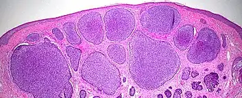 Dermal macrophages are the essential component of the hair follicle immune system.[1] They generally facilitate hair growth.[1] There are three steps of hair growth: catagen, anagen and telogen. During catagen, dermal macrophages' population decreases progressively when the hair grows. The number of dermal macrophages in hair follicles reaches a minimum during telogen (resting state) and increases during anagen (beginning of another growth cycle).[1][2]