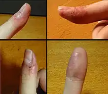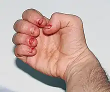 Dermatophagia (from Ancient Greek δέρμα (derma) 'skin' and φαγεία (phageia) 'eating') or dermatodaxia (from δήξις (dexis) 'biting')[3] is a compulsion disorder of gnawing or biting one's own skin, most commonly at the fingers. This action can either be conscious or unconscious[4] and it is considered to be a type of pica. Those affected with dermatophagia typically bite the skin around the nails, leading to bleeding and discoloration over time. Some people also bite on their skin on their finger knuckles which can lead to pain and bleeding just by moving their fingers.