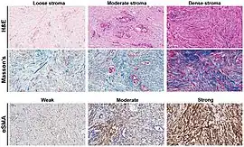 Clinical presentation of a lump in the breast is histologically viewed as a collagenous tumor or desmoplastic response created by myofibroblasts of the tumor stroma.[18] Proposed mechanisms of activation of myofibroblasts are by immune cytokine signaling, microvascular injury, or paracrine signaling by tumor cells.[18]