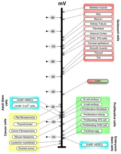 C.D. Cone studied the role of resting potential in regulating cell differentiation and proliferation.[49][50] Subsequent work has identified specific regions of the resting potential spectrum that correspond to distinct cell states such as quiescent, stem, cancer, and terminally differentiated.[51]