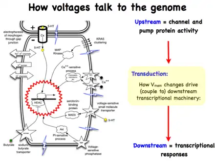 Life is ultimately an electrochemical enterprise; research in this field is progressing along several frontiers. First is the reductive program of understanding how bioelectric signals are produced, how voltage changes in the cell membrane are able to regulate cell behavior, and what the genetic and epigenetic downstream targets of bioelectric signals are. A few mechanisms that transduce bioelectric change into alterations of gene expression are already known, including the bioelectric control of movement of small second-messenger molecules through cells, including serotonin and butyrate, voltage sensitive phosphatases, among others.[206][207] Also known are numerous gene targets of voltage signaling, such as Notch, BMP, FGF, and HIF-1α.[128] Thus, the proximal mechanisms of bioelectric signaling within single cells are becoming well-understood, and advances in optogenetics[80][172][4][208][209] and magnetogenetics[210] continue to facilitate this research program. More challenging however is the integrative program of understanding how specific patterns of bioelectric dynamics help control the algorithms that accomplish large-scale pattern regulation (regeneration and development of complex anatomy). The incorporation of bioelectrics with chemical signaling in the emerging field of probing cell sensory perception and decision-making[211][212][213][214][215][216] is an important frontier for future work.